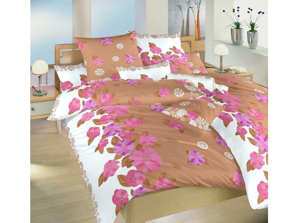 Krepové ložní povlečení – romantický design s květinovým vzorem v béžové, bílé a růžové.