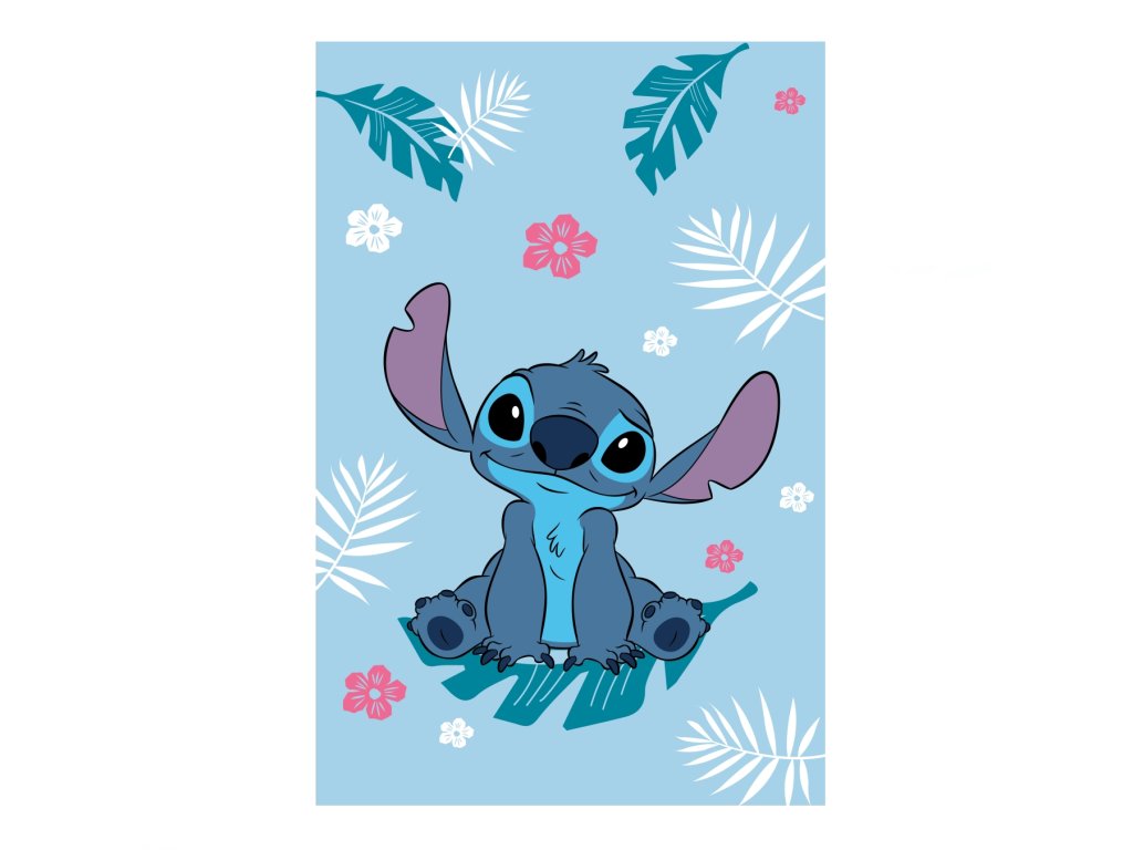 Roztomilá fleecová deka s oblíbenou postavičkou Stitche potěší každého fanouška Disney pohádek. Na světle modrém podkladu sedí Stitch s typickým úsměvem, obklopený tropickými listy a květinami. Rozměr 100×150 cm, ideální na přikrytí, hraní i odpočinek.