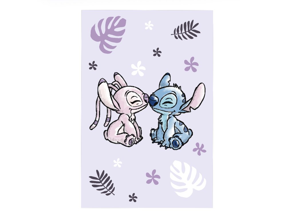 Roztomilá fleecová deka s postavičkami Stitche a Angel potěší každého fanouška Disney pohádek. Na světle fialovém podkladu se dvě postavičky něžně dotýkají nosy, obklopené květinovými a listovými vzory. Rozměr 100×150 cm, ideální na přikrytí, hraní i odpočinek.