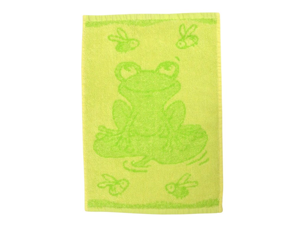 Veselý dětský ručníček Frog green přináší radostný motiv žabky na leknínu obklopené muškami. Obrázek je vetkaný z obou stran, což zajišťuje delší životnost a stálost motivu.