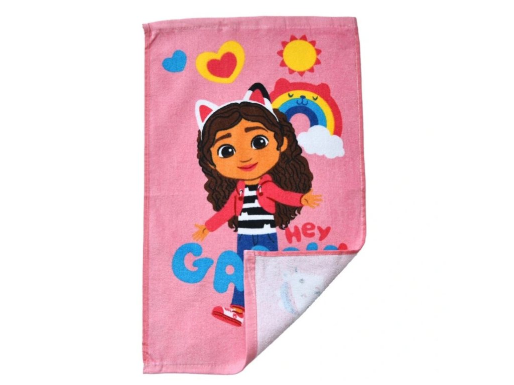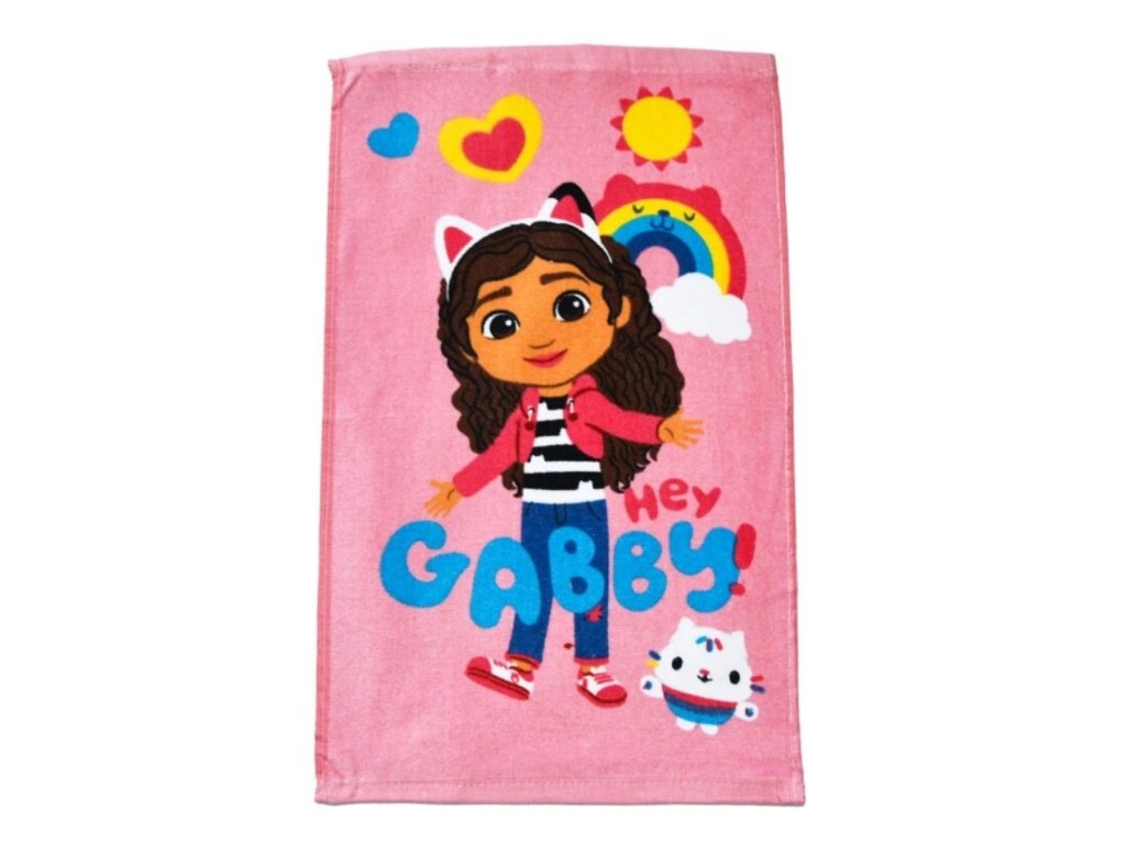 Objevte kouzelný svět s dětským ručníkem Gábinin kouzelný domek – Ahoj Gábi. Roztomilý motiv Gábi s kočičími oušky a jejím bílým kočičím kamarádem na růžovém pozadí s duhou, sluncem a srdíčky potěší každého malého fanouška této oblíbené pohádky.