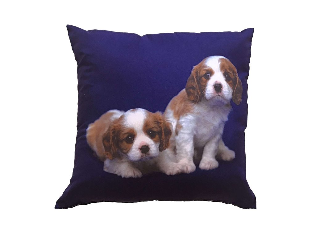 Roztomilý polštářek s fototiskem dvou štěňat v odstínech béžové a hnědé na tmavě modrém pozadí. Jedno štěně leží, druhé sedí vedle něj, což vytváří klidnou a přátelskou kompozici. Skvělý doplněk pro milovníky pejsků.