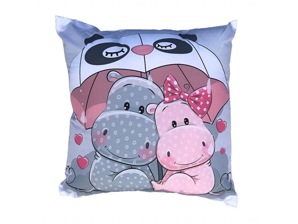 Roztomilý polštářek s kresleným motivem dvou hrošíků sedících pod deštníkem s pandím obličejem. Jeden hrošík je šedý s bílými puntíky, druhý růžový s mašličkou. Okolí zdobí malé červené srdíčka, která dodávají motivu něhu a láskyplnou atmosféru.