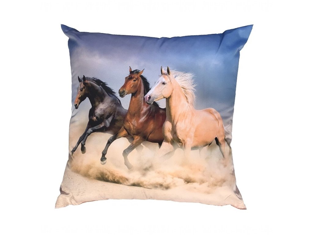 Dramatický a energický polštářek s fototiskem tří koní běžících pouští. Koně víří písek pod kopyty a za nimi se rozprostírá modrá obloha. Tento motiv přináší do interiéru sílu, svobodu a pohyb.