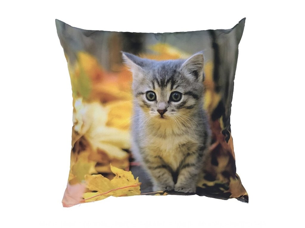 Hřejivý a roztomilý polštářek s fototiskem kotěte obklopeného podzimními listy. Kotě sedí uprostřed a dívá se přímo do objektivu, zatímco pozadí tvoří rozmazané listí v odstínech žluté, oranžové a hnědé. Ideální doplněk pro podzimní atmosféru domova.
