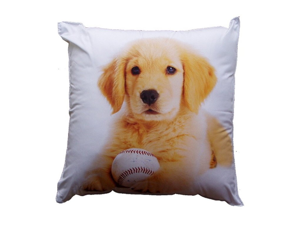 Roztomilý polštářek s fototiskem štěněte zlatého retrívra, které drží v tlamě baseballový míček. Štěně se dívá přímo do objektivu, což vytváří dojem hravosti a přátelskosti. Bílý podklad zvýrazňuje detaily srsti i samotný míček.