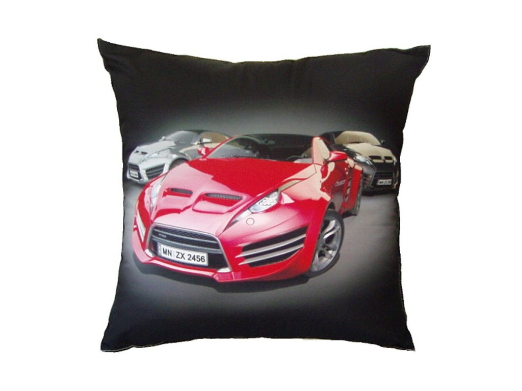 Stylový a dynamický polštářek s fototiskem tří sportovních vozů. Dominantní červené auto je v popředí, zatímco bílé a černé vozy tvoří pozadí. Tmavé pozadí zvýrazňuje lesk karoserií a dodává motivu dramatický nádech.