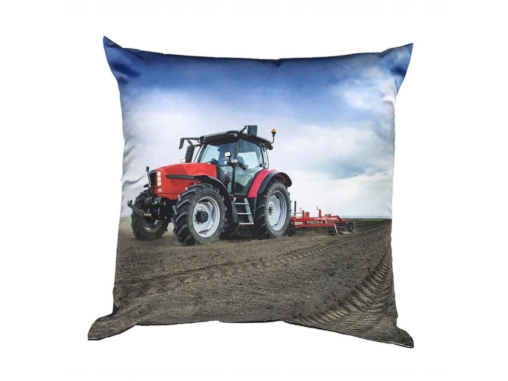 Stylový polštářek s fototiskem červeného traktoru pracujícího na poli. Traktor je zachycen uprostřed jízdy po čerstvě zorané půdě pod částečně zataženou oblohou. Ideální doplněk pro milovníky zemědělské techniky a venkovského stylu.