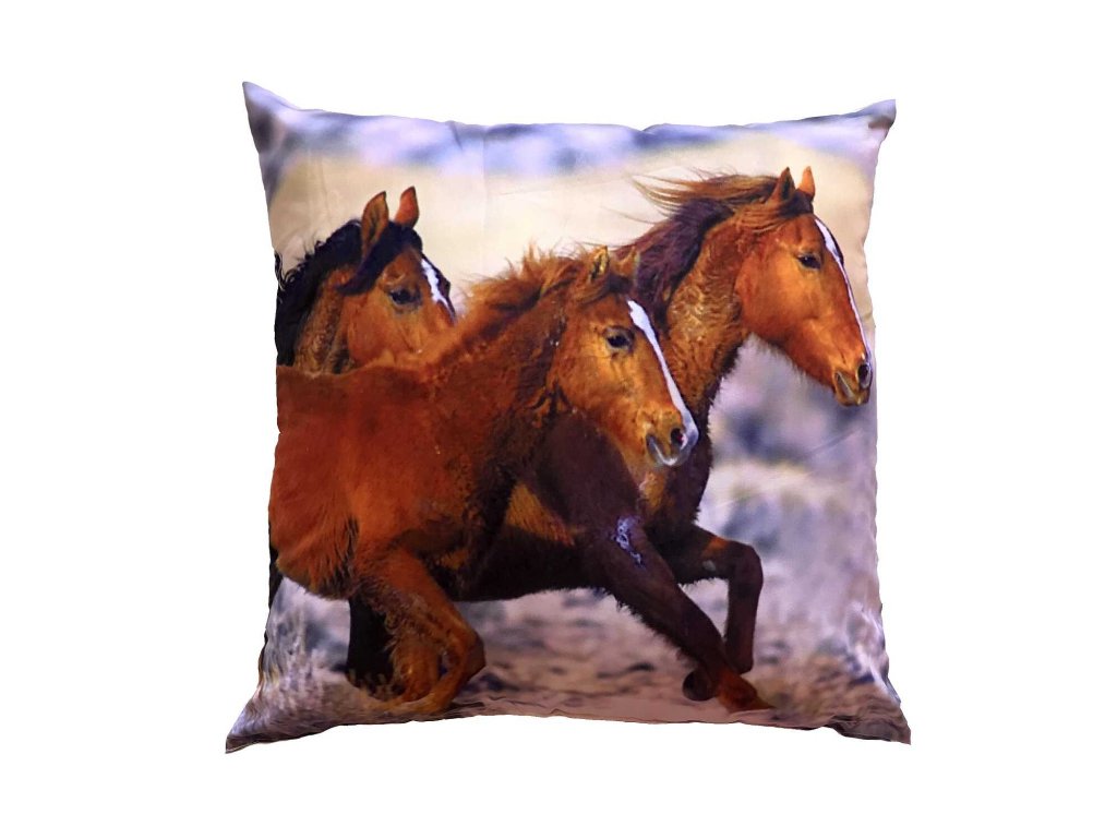 Detailní tisk zachycuje tři koně v běhu, s důrazem na jejich svaly, hřívy a energii. Hnědé tóny srsti a živé barvy dodávají polštářku přirozený a působivý vzhled.