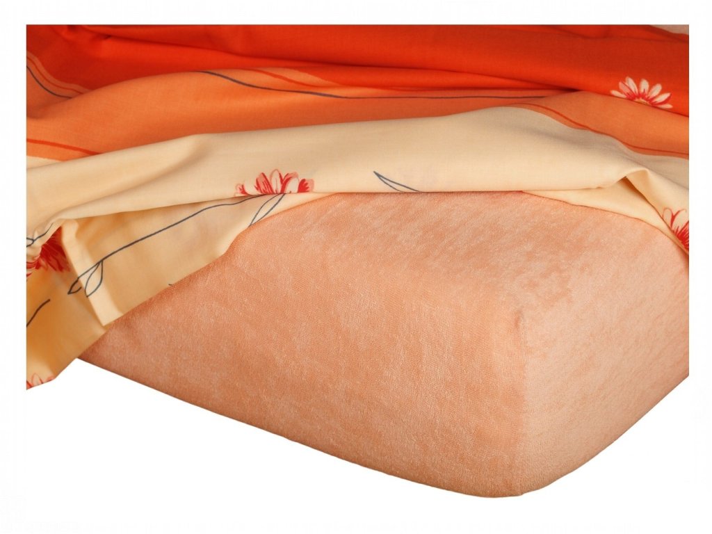 Meruňkové napínací froté prostěradlo je vyrobeno z kvalitní směsi 80 % česané bavlny a 20 % polyesteru. Tento materiál je pružný, rozměrově stálý, prodyšný a příjemný na dotek. Hebká froté smyčka dodává prostěradlu jemnost a komfort po celý rok.