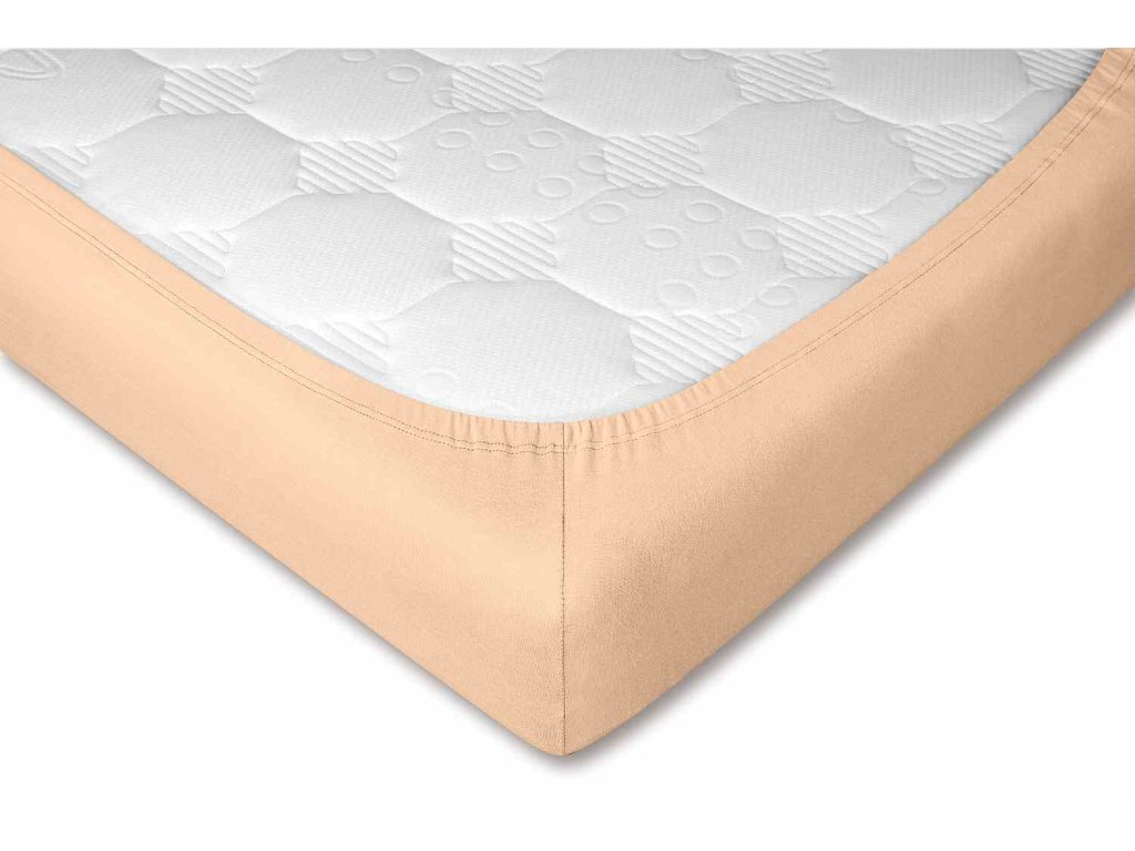 Napínací jersey prostěradlo v medové barvě je ušito z kvalitní směsi 95 % česané bavlny a 5 % elastanu. Tato kombinace zajišťuje vysokou pružnost, rozměrovou stálost a dokonalé přilnutí k matraci. Hladký jersey materiál je příjemný na dotek a ideální pro celoroční použití.