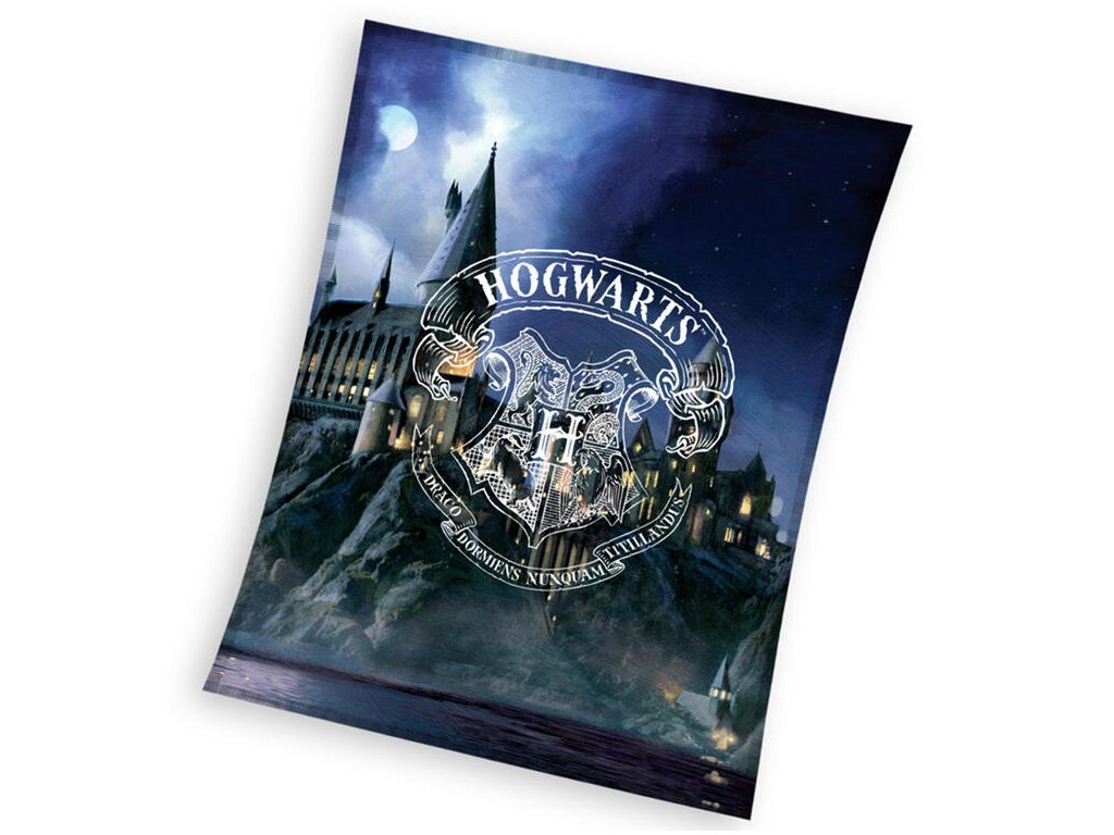 Dětská deka Harry Potter Bradavická škola zobrazuje školu čar a kouzel v Bradavicích, zářící do noci, kde do popředí vystupuje erb Lycea Hogwarts.