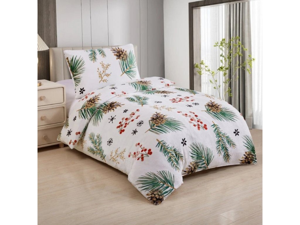 Stylové zimní povlečení Mikroflanel Conifer vnese do ložnice útulnou atmosféru. Motiv jehličí, šišek a bobulí na bílém podkladu působí svěže a slavnostně. Mikroflanel je hebký, hřejivý a příjemný na dotek.