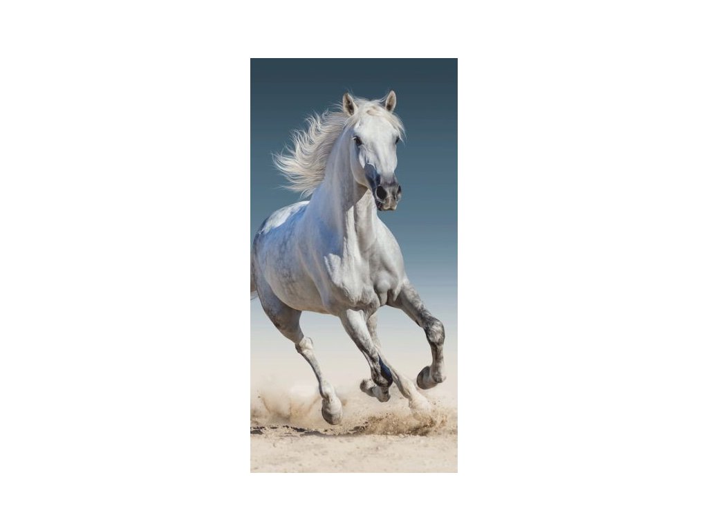 Zábavná osuška s dynamickým motivem krásného bílého hřebce v pohybu zaujme všechny fanoušky těchto nádherných zvířat. Působivý design s zaprášeným pozadím dodá koupání nebo pobytu u vody tu pravou energii.