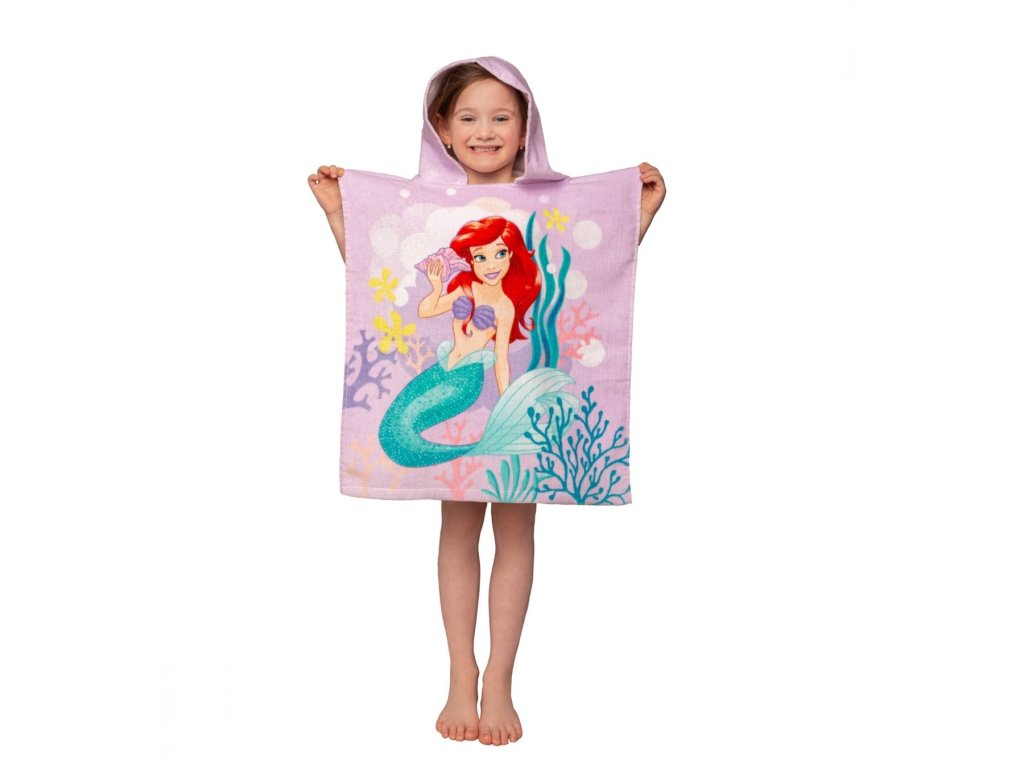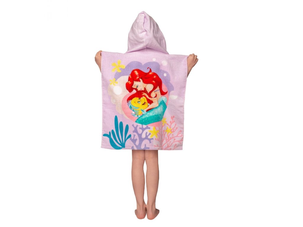 Stylové pončo s motivem Ariel z Malé mořské víly přináší radost a pohodlí po každém koupání. Přední stranu zdobí Ariel s mořskou mušlí, zadní Ariel objímající Floundera – vše na růžovém podkladu s bublinkami a mořskými rostlinami. Pončo je ideální jako osuška i župánek a díky kapuci krásně zahřeje.
