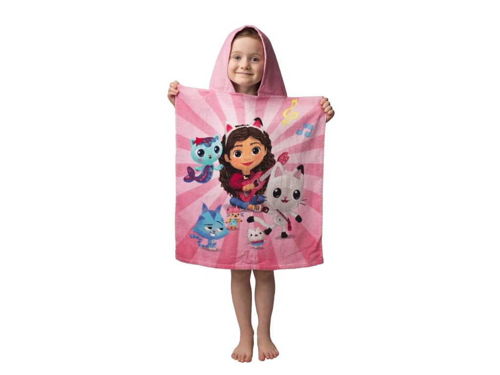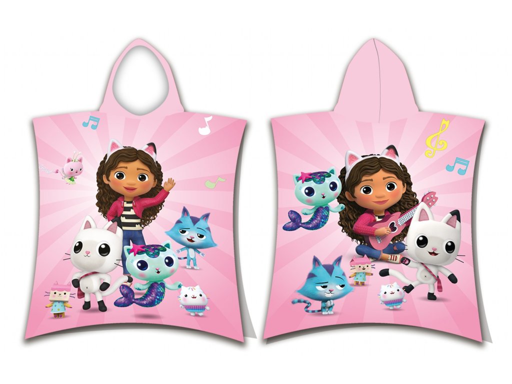 Stylové pončo s motivem Gabby's Dollhouse přináší radost a pohodlí po každém koupání! Přední stranu zdobí Gabby a několik kočičích postaviček, zadní stranu doplňují další animované postavičky – vše na růžovém podkladu s hudebními notami. Pončo je ideální jako osuška i župánek, a díky kapuci krásně zahřeje.