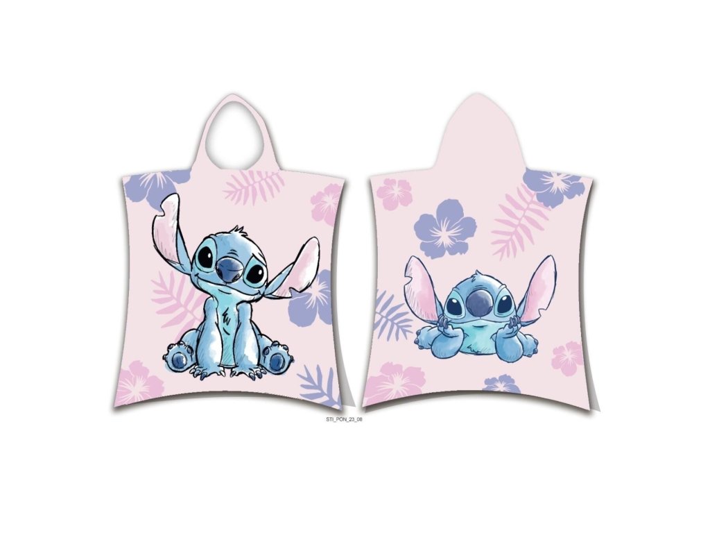 Stylové pončo s motivem Lilo a Stitch přináší radost a pohodlí po každém koupání! Přední stranu zdobí Stitch sedící s ušima nahoru, zadní stranu Stitch sedící s ušima dolů – to vše na růžovém podkladu s fialovými a modrými květinovými vzory. Pončo je ideální jako osuška i župánek, a díky kapuci krásně zahřeje.