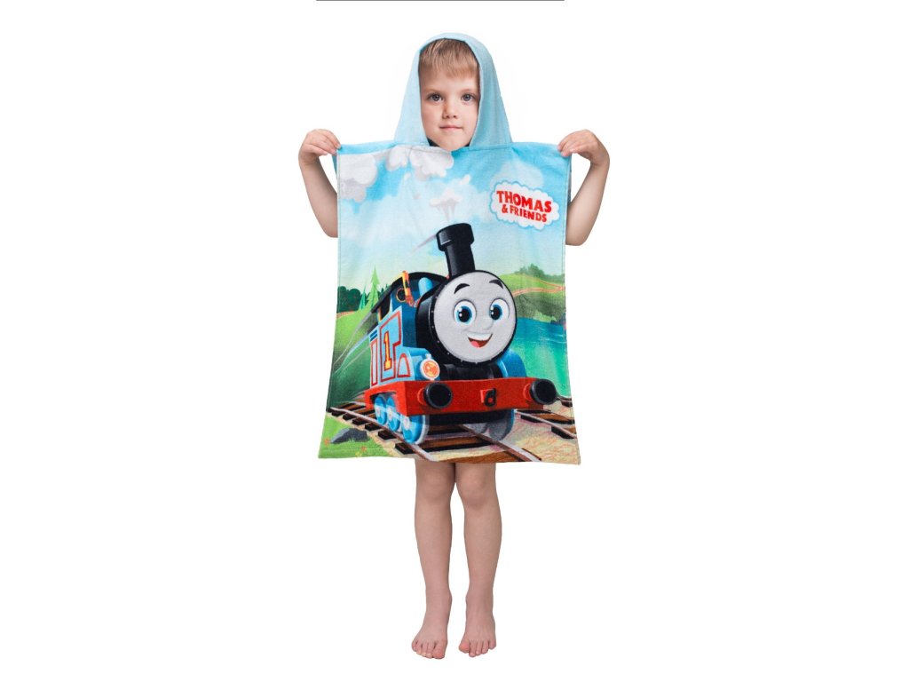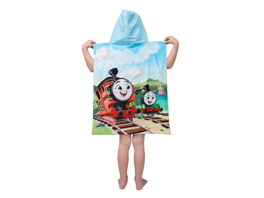 Stylové pončo s motivem Mašinky Tomáše přináší radost a pohodlí po každém koupání! Přední stranu zdobí Mašinka Tomáš, zadní dvě další vláčky – vše na pozadí s malebnou krajinou, zelenými kopci, modrou oblohou a mraky. Pončo je ideální jako osuška i župánek, a díky kapuci krásně zahřeje.
