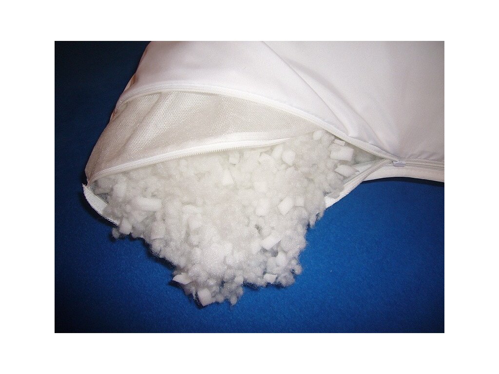 Uvnitř polštáře je vložen vak s náplní (kuličky, lze natřepat jako peří).