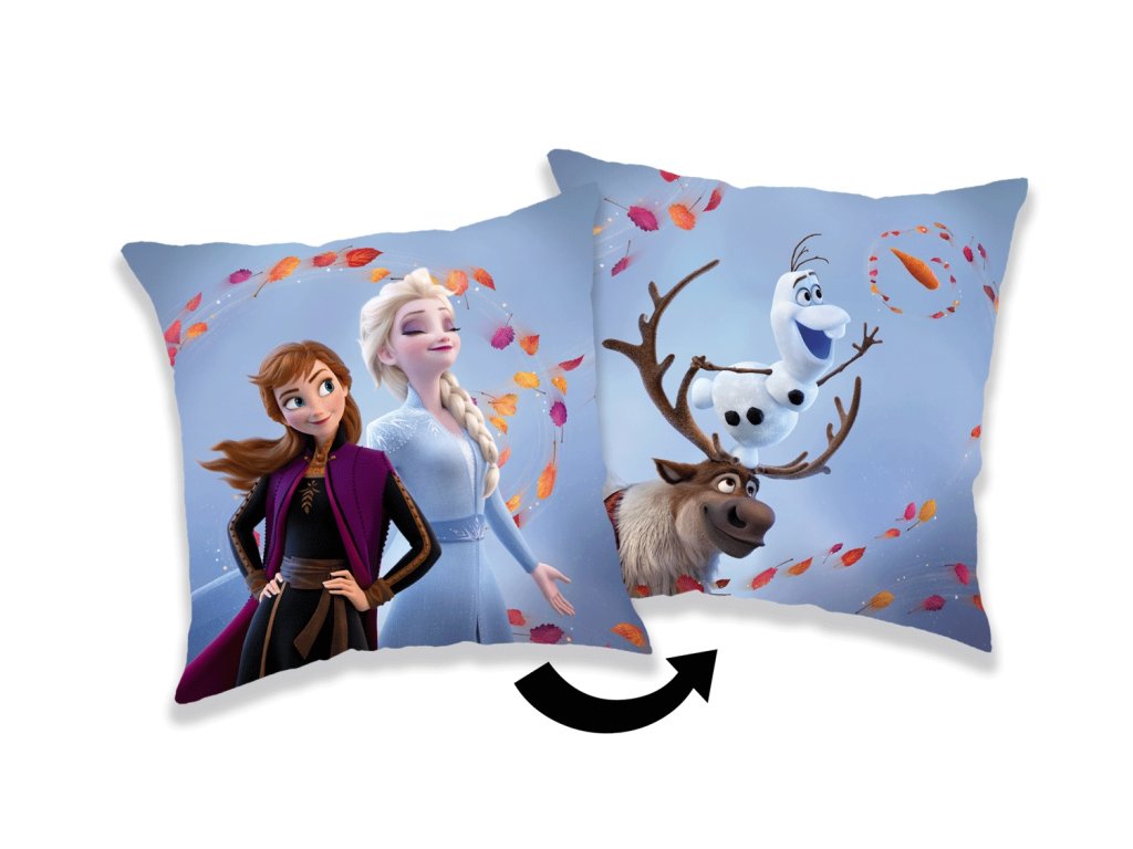 Oboustranný polštářek s motivem z filmu Ledové království 2 přináší kouzelnou atmosféru Arendelle do každého dětského pokoje. Na jedné straně jsou sestry Anna a Elsa, na druhé straně oblíbení Olaf a sob Sven. Ideální pro malé fanoušky pohádek a zimních dobrodružství.