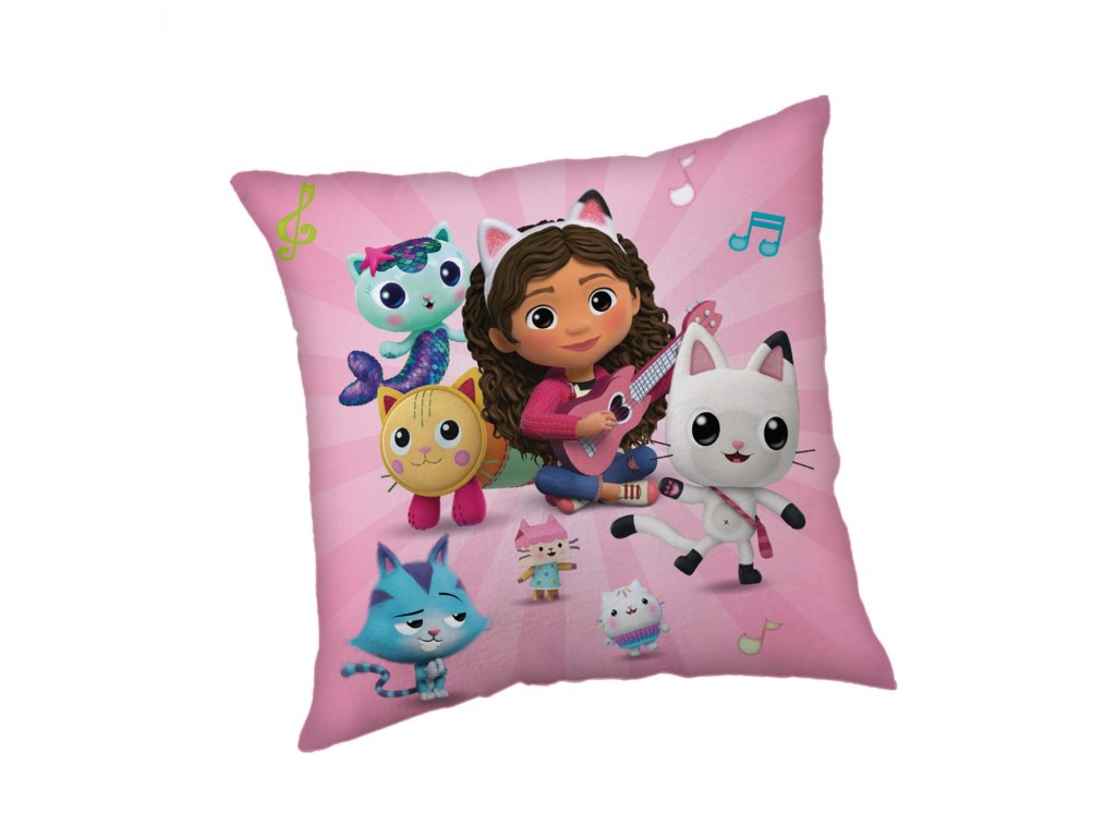 Rozkošný polštářek inspirovaný oblíbeným dětským seriálem Gabby's Dollhouse potěší každého malého fanouška. Na růžovém pozadí s paprsky sedí Gabby s kytarou a čelenkou s kočičími oušky, obklopená veselými kočičími postavičkami. Rozměr 40×40 cm, ideální jako dekorace i pro pohodlný odpočinek.