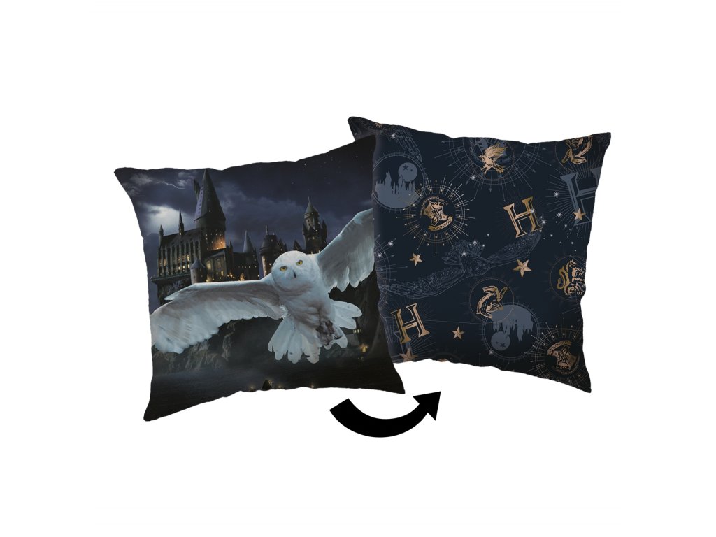 Stylový polštářek inspirovaný světem Harryho Pottera potěší každého fanouška kouzel. Na jedné straně je vyobrazena bílá sova letící před siluetou Bradavic, na druhé straně tmavý vzor s hvězdami, měsíci a písmenem „H“. Rozměr 40×40 cm, ideální jako dekorace i pro pohodlný odpočinek.