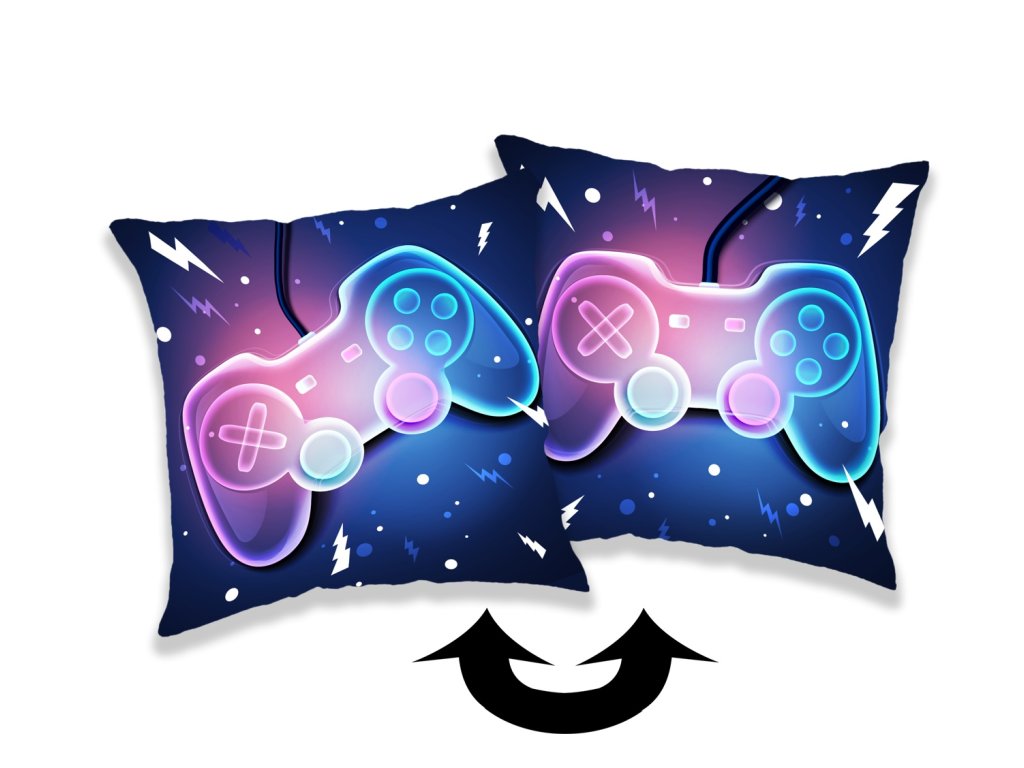 Moderní polštářek s motivem neonového herního ovladače je ideální doplněk pro každého malého i velkého hráče. Obě strany polštářku zdobí zářivý ovladač v odstínech modré, růžové a fialové na tmavém pozadí s blesky a hvězdami. Rozměr 40×40 cm, perfektní do herního koutku, na gauč i do pokoje.