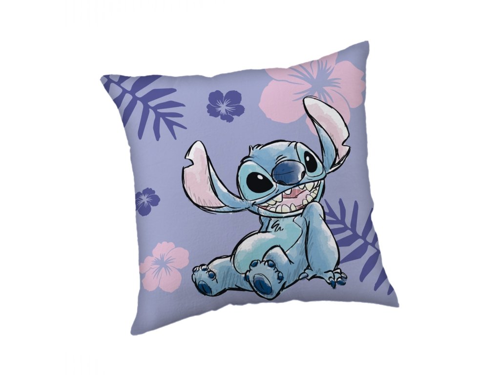 Na jedné straně je Stitch v sedící pozici s typickým širokým úsměvem, obklopený květinovým pozadím. Rozměr 40×40 cm, ideální pro malé i velké fanoušky havajských dobrodružství.