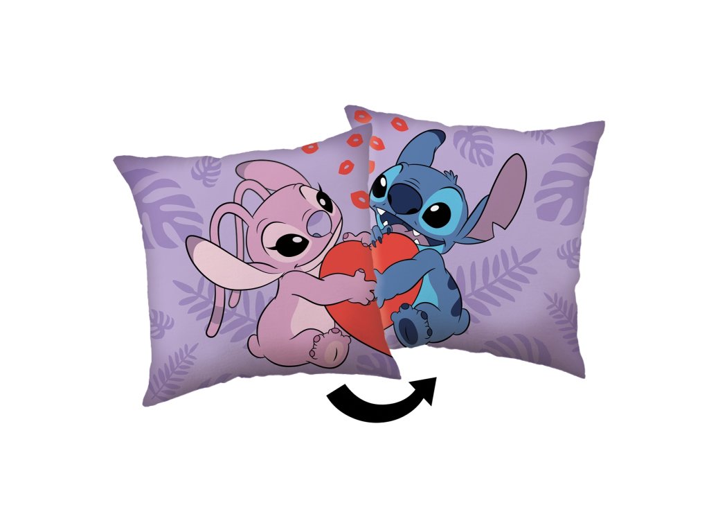Roztomilý oboustranný polštářek s motivem postaviček z oblíbeného animovaného filmu „Lilo & Stitch“ přináší do dětského pokoje nádech lásky a tropické pohody. Na fialovém pozadí s listovým vzorem drží růžová a modrá postavička společně červené srdce – ideální pro malé i velké fanoušky tohoto mimozemského příběhu.