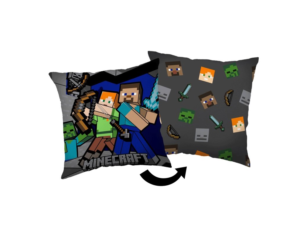 Oboustranný polštářek s motivem z populární hry Minecraft potěší každého hráče. Na jedné straně jsou postavy Steve a Alex s mečem a krumpáčem připraveni na dobrodružství, doplněné logem „MINECRAFT“. Druhá strana nabízí stylový vzor s ikonami ze hry – meče, krumpáče, Creepeři a další prvky na tmavém pozadí. Rozměr 40×40 cm, ideální do pokoje každého fanouška pixelového světa.
