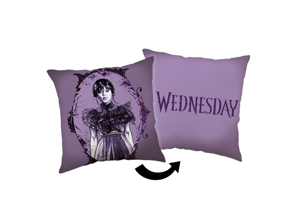 Elegantní oboustranný polštářek inspirovaný postavou Wednesday Addams vyniká gotickým stylem a výraznou fialovou barvou. Jedna strana zobrazuje siluetu dívky v tmavých šatech v ozdobném rámu, druhá strana nese nápis „WEDNESDAY“ ve stylizovaném písmu. Rozměr 40×40 cm, ideální pro fanoušky temné estetiky a originálního designu.