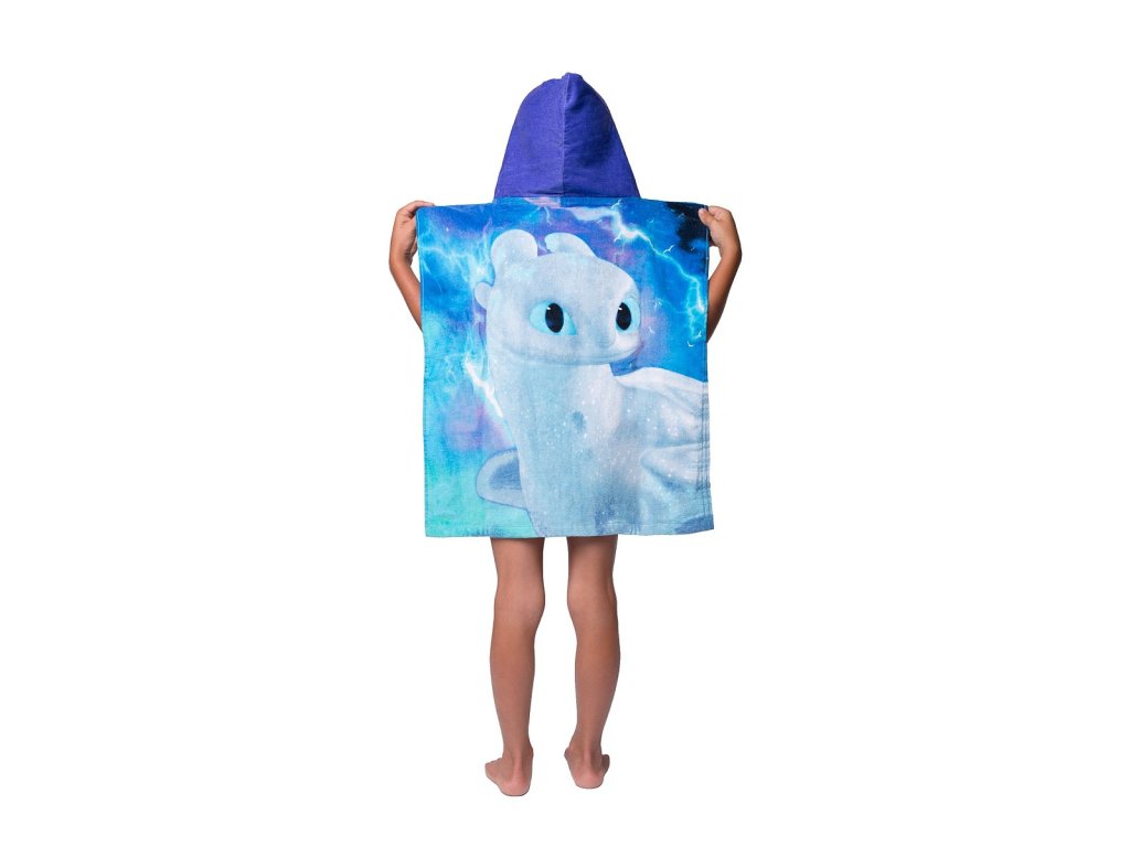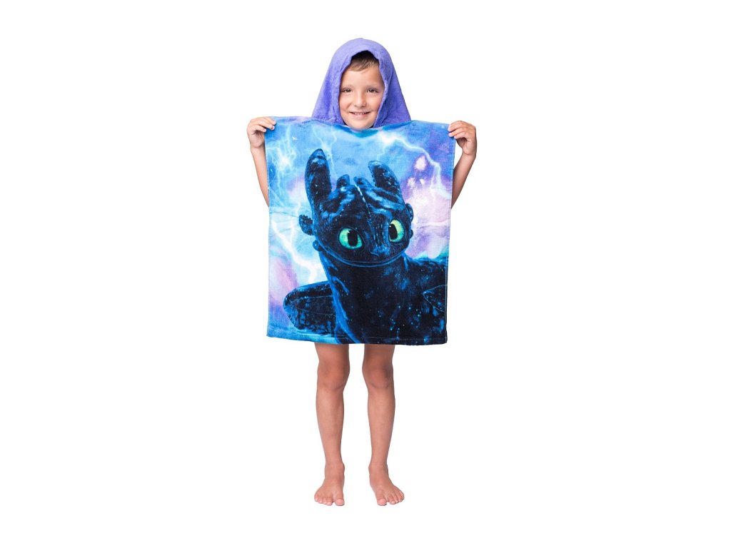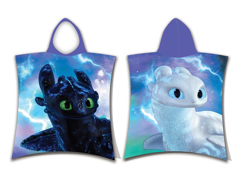 Stylové pončo s motivem Jak vycvičit draka přináší radost a pohodlí po každém koupání. Přední stranu zdobí Toothless, černý drak Night Fury se zelenýma očima, zadní stranu Light Fury, bílý drak s modrýma očima – vše na pozadí oblačné oblohy s blesky. Pončo je ideální jako osuška i župánek a díky kapuci krásně zahřeje.