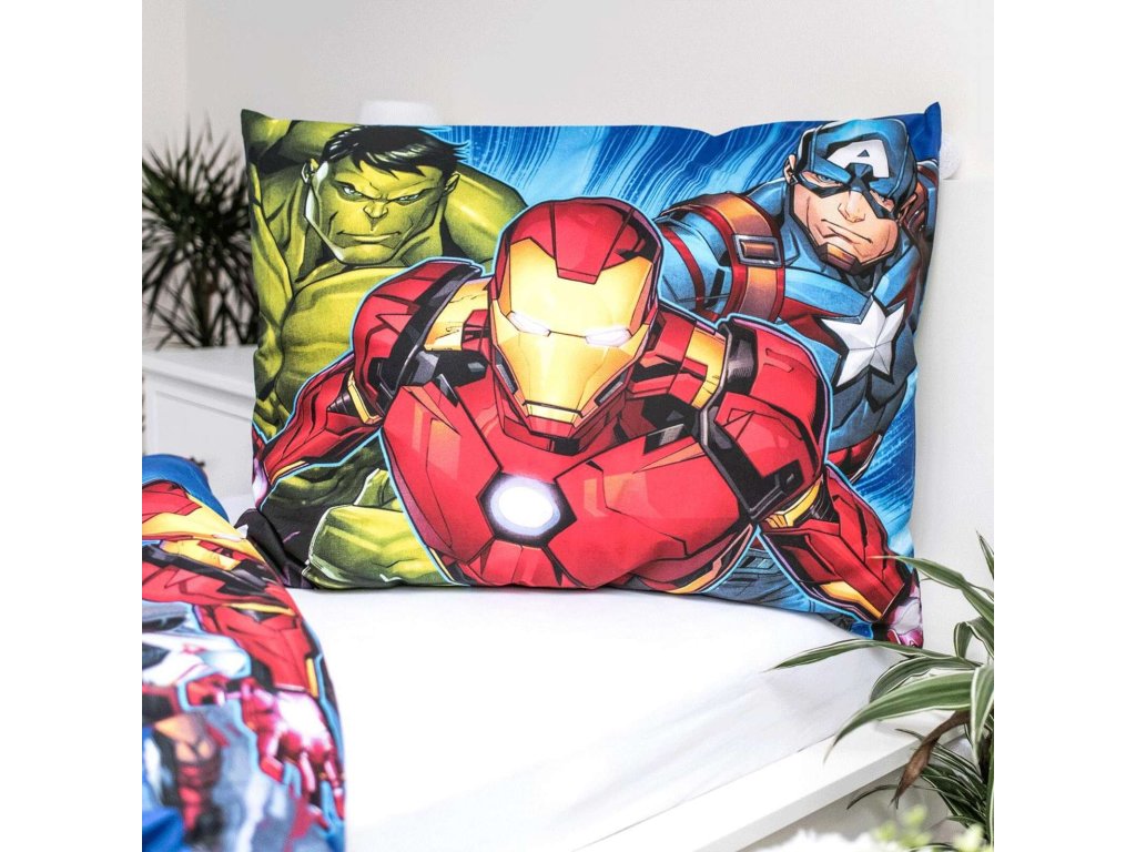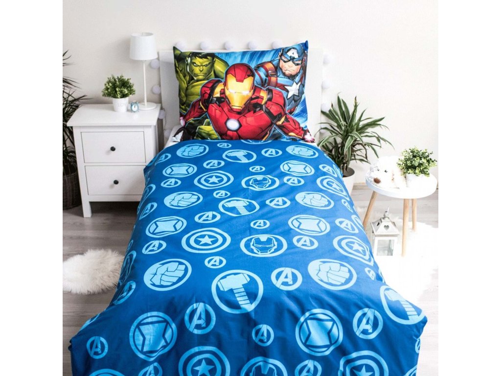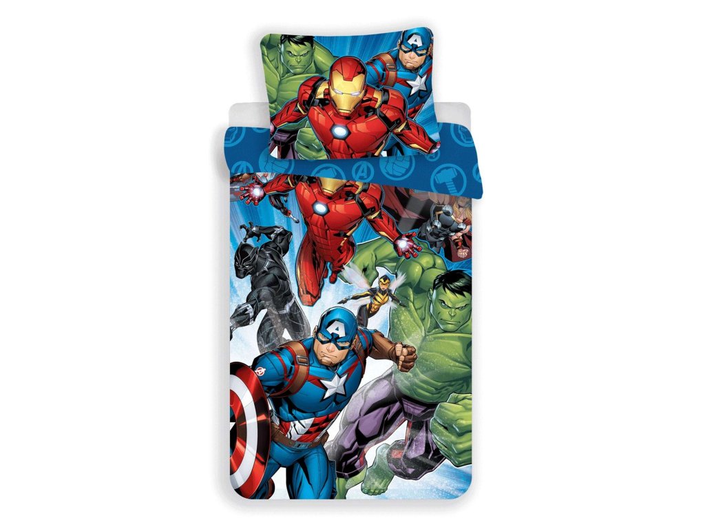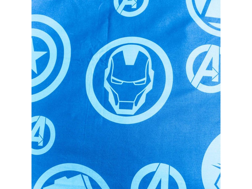 Na modrém pozadí se vyjímají postavy jako Iron Man, Captain America, Hulk a další v dynamických pózách. Rozměr 140×200 cm (přikrývka) a 70×90 cm (polštář) je ideální pro všechny malé fanoušky Marvel světa.