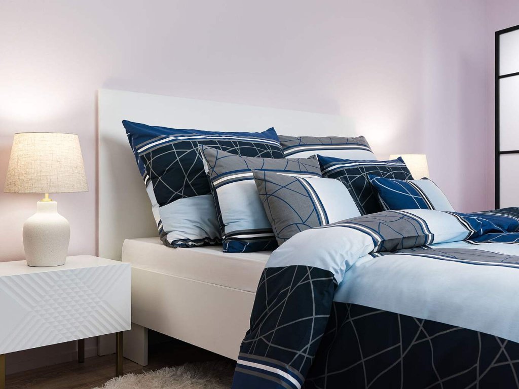 Stylové ložní prádlo s geometrickým vzorem Bruno modrý v odstínech modré, bílé a tmavě šedé přináší do ložnice moderní eleganci. Vzor tvoří horizontální pruhy s jemnými oblouky, které působí klidně a vyváženě. Povlečení doporučujeme kombinovat s prostěradly v barvě bílá, tmavě šedá nebo světle modrá. Vyrobeno v České republice firmou DADKA VRACOV.