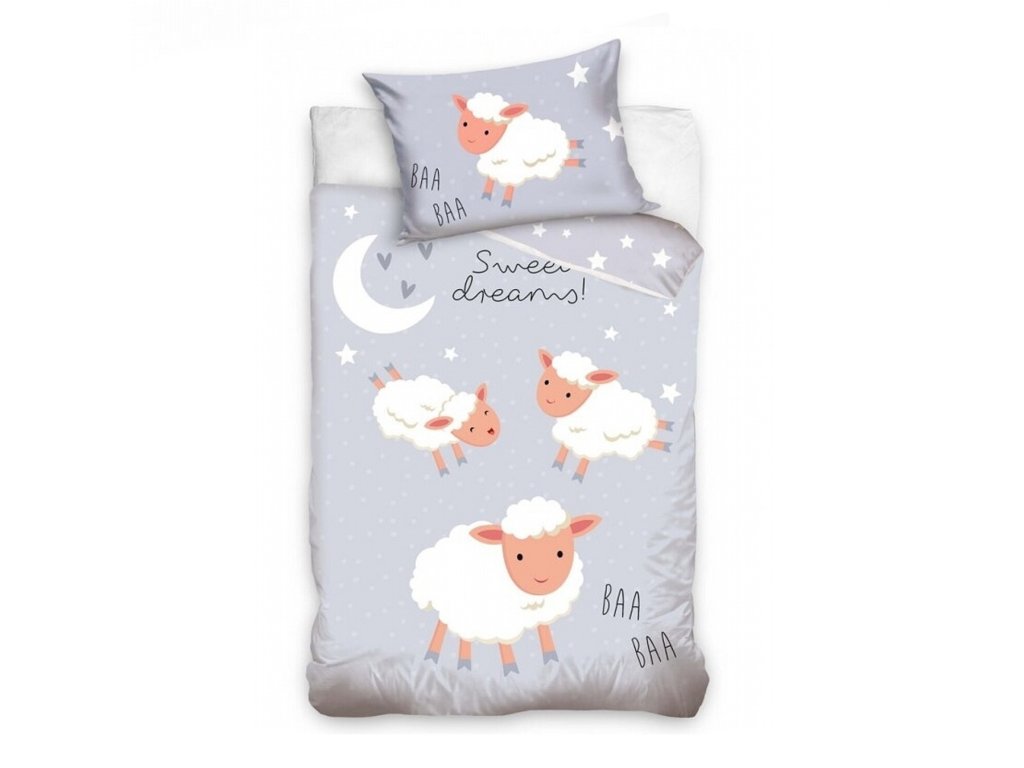 Povlečení má světle šedou barvu s drobnými bílými puntíky, které tvoří pozadí. Na povrchu jsou tři roztomilé bílé ovečky s růžovými tvářemi a ušima, které vypadají jako by skákaly po obloze. Nad nimi je nápis „Sweet dreams!“ napsaný černým písmem. V horní části povlečení je také bílý měsíc a několik hvězdiček, které dodávají celkovému designu kouzelnou atmosféru. Na polštáři se nachází jedna ovečka a nápis „BAA BAA“ opakující se dvakrát vedle ní.