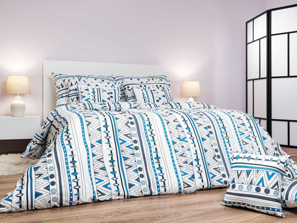 Stylové ložní prádlo Indián denim s výrazným geometrickým vzorem v odstínech modré, černé a bílé přináší do ložnice energii a originalitu. Motiv inspirovaný etnickými prvky v kombinaci s denimovým tónem působí moderně a zároveň tradičně. Povlečení doporučujeme kombinovat s prostěradly v barvě bílá, tmavě šedá, černá nebo denim. Vyrobeno v České republice firmou DADKA VRACOV.