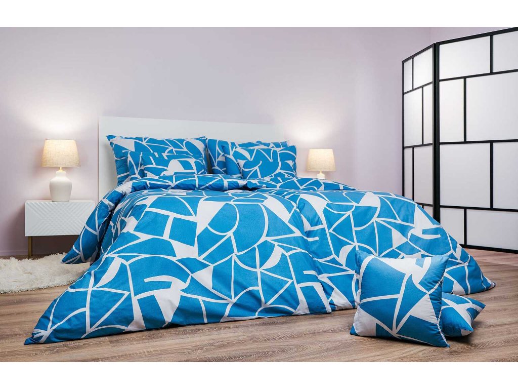 Moderní ložní prádlo Julius modrý s abstraktním vzorem v modré barvě na bílém podkladu přináší do ložnice svěžest a styl. Kombinace modrých tvarů a čistého pozadí působí elegantně a nadčasově. Povlečení doporučujeme kombinovat s prostěradly v barvě bílá, denim, šedá nebo stříbrná. Vyrobeno v České republice firmou DADKA VRACOV.
