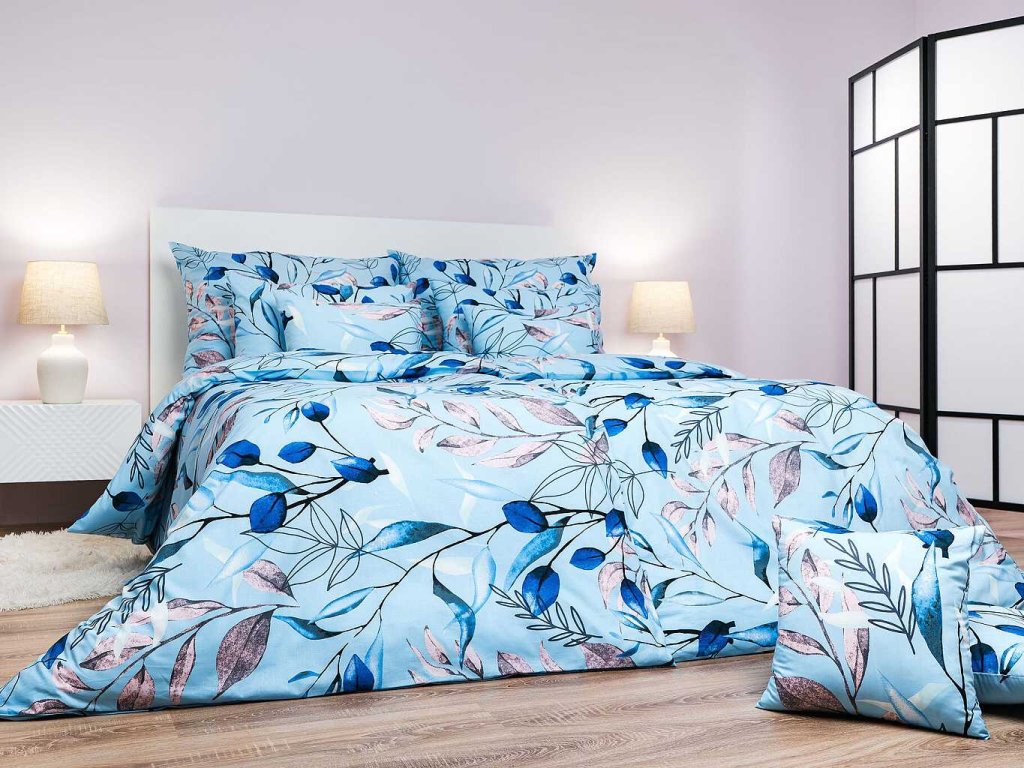 Elegantní ložní prádlo s přírodním motivem Milaya modrá v odstínech modré, šedé a růžové na světle modrém podkladu přináší do ložnice jemnost a svěžest. Vzor listů a větviček působí vzdušně a harmonicky. Povlečení doporučujeme kombinovat s prostěradly v barvě královsky modrá, denim, banánová, bílá, béžová nebo tmavě šedá. Vyrobeno v České republice firmou DADKA VRACOV.