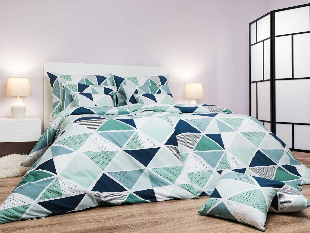 Moderní ložní prádlo Pyramidy mentol s geometrickým vzorem tvořeným trojúhelníky v odstínech mentolové, bílé a tmavě šedé dodá vaší ložnici svěží a stylový vzhled. Doporučujeme kombinovat s prostěradly v barvě bílá, mentolová nebo tmavě šedá. Vyrobeno v České republice firmou DADKA VRACOV.