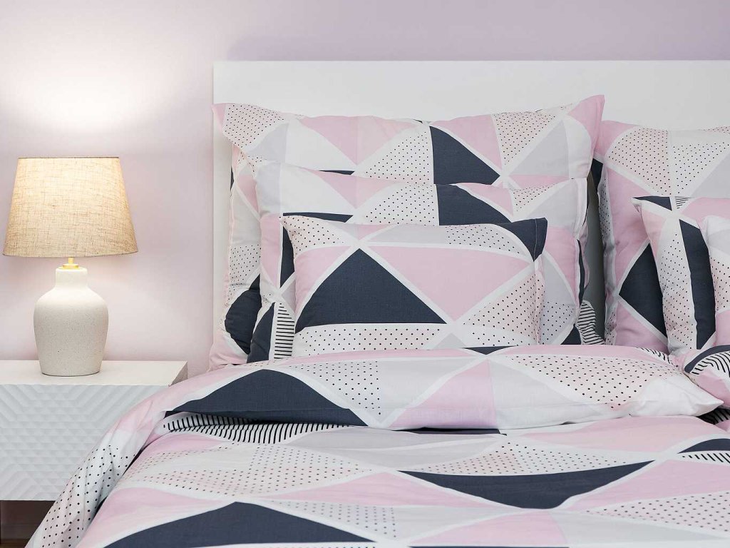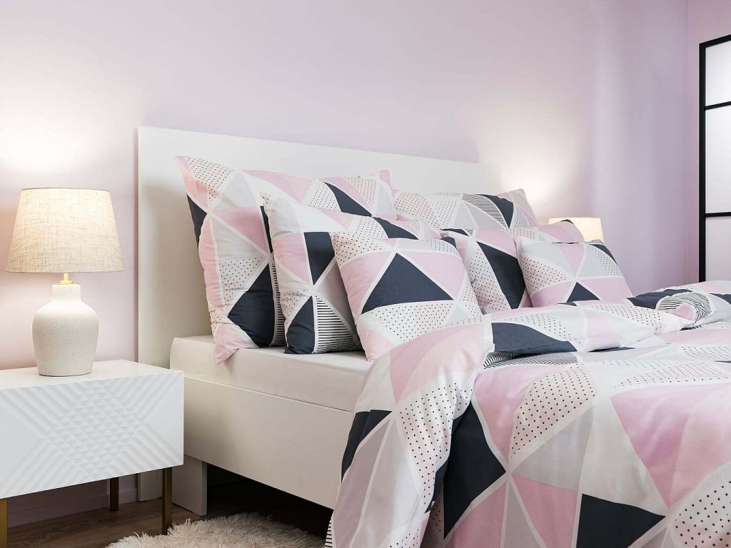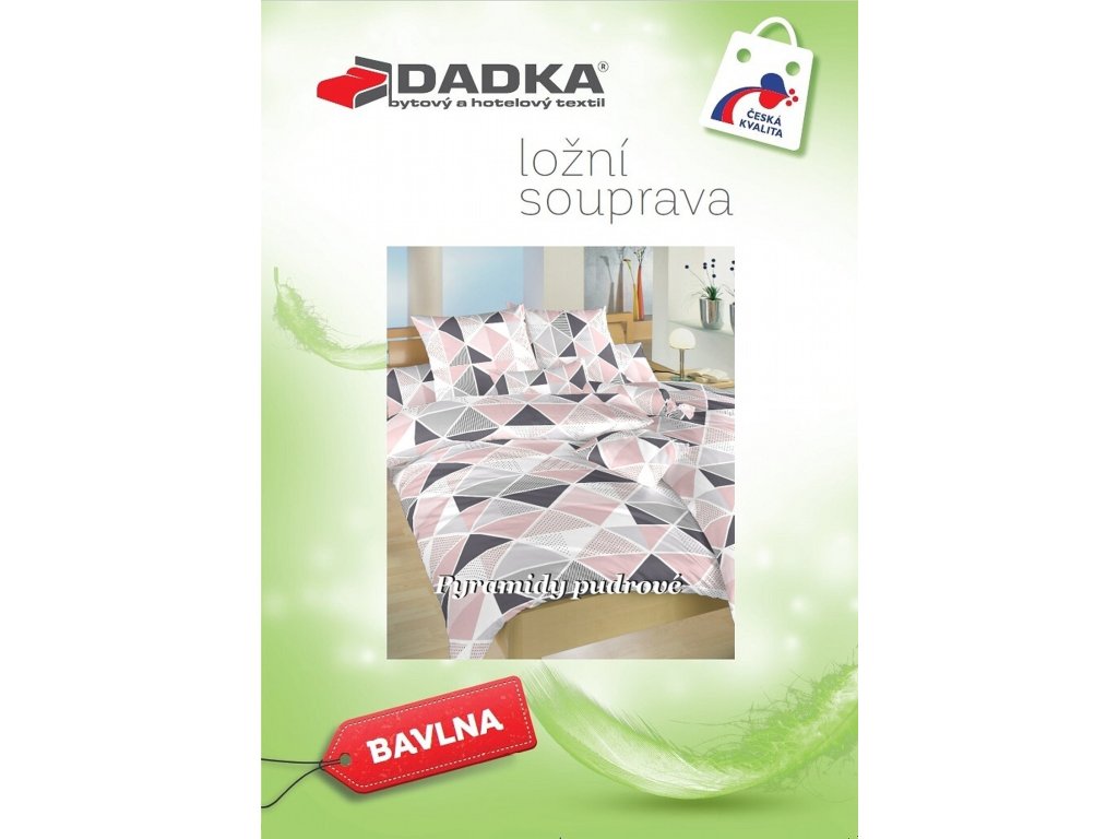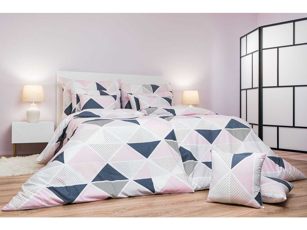Stylové ložní prádlo Pyramidy pudrové s moderním trojúhelníkovým vzorem v odstínech pudrové růžové, šedé a bílé přináší do ložnice jemnost a eleganci. Doporučujeme kombinovat s prostěradly v barvě bílá, pudrová, šedá, stříbrná nebo tmavě šedá. Vyrobeno v České republice firmou DADKA VRACOV.