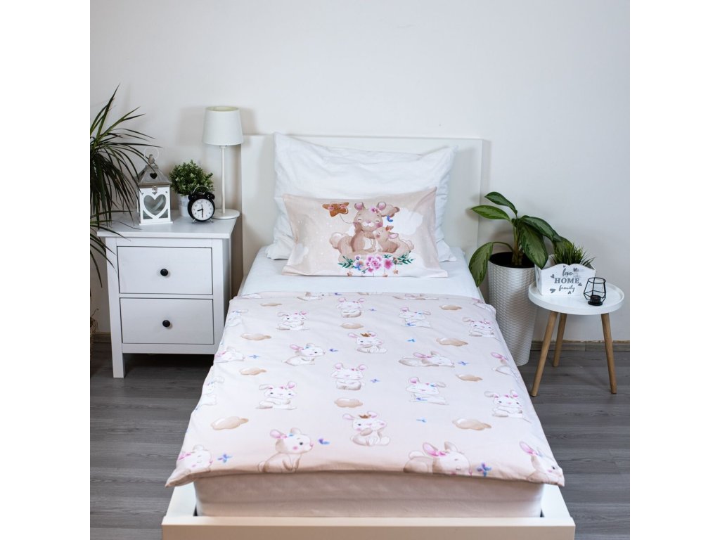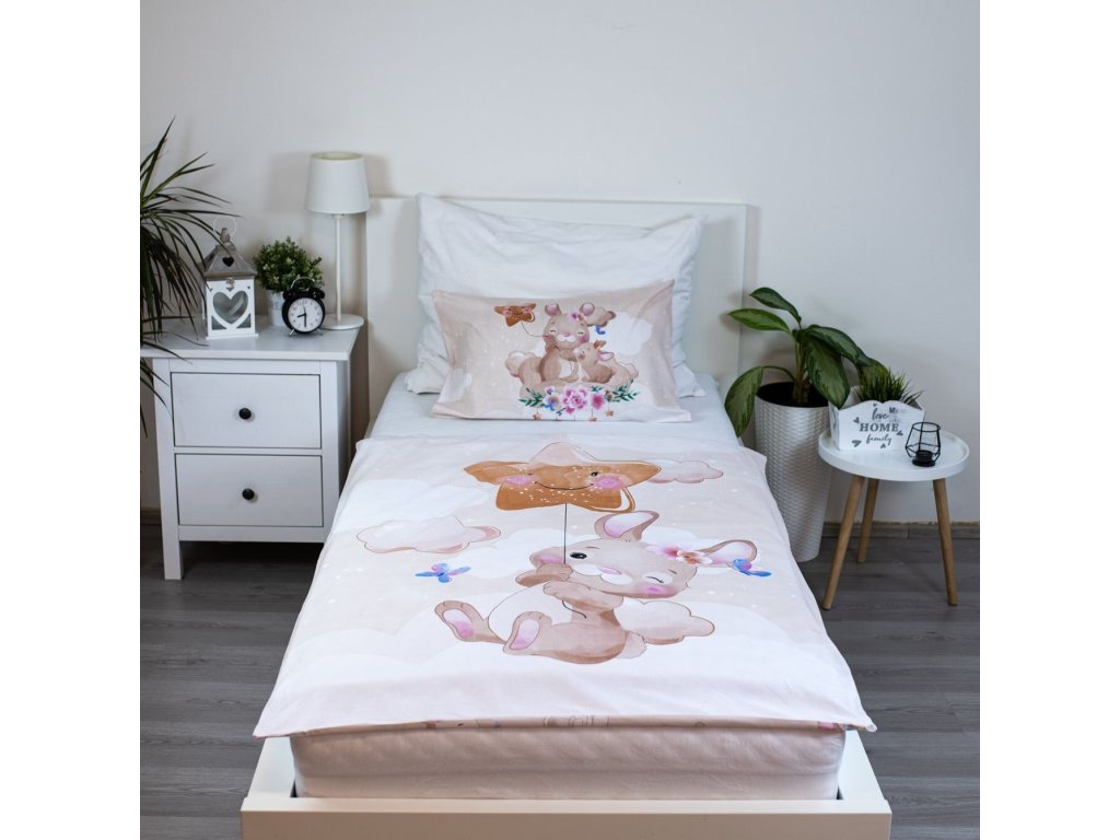 Vytvořte svému dítěti klidné a kouzelné prostředí pro spánek s povlečením laděným do jemných pastelových barev. Přikrývku zdobí veselý králíček držící oranžovou hvězdičku, obklopený bílými obláčky a drobnými květinkami. Polštářek doplňuje stejný motiv králíčka s květinovým věnečkem na hlavě, což dodává celému setu jednotný a harmonický vzhled.