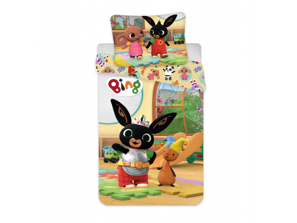 Vneste do dětského pokojíčku radost a fantazii s povlečením Králíček Bing 052 baby! Barevný design s oblíbenými postavičkami z dětského seriálu Bing potěší každého malého fanouška. Na přikrývce je Bing jako rytíř s korunkou a Flop jako šašek, v pozadí hračky a okno do zahrady. Polštář zdobí Bing a Sula na barevné podložce s veselým výrazem.