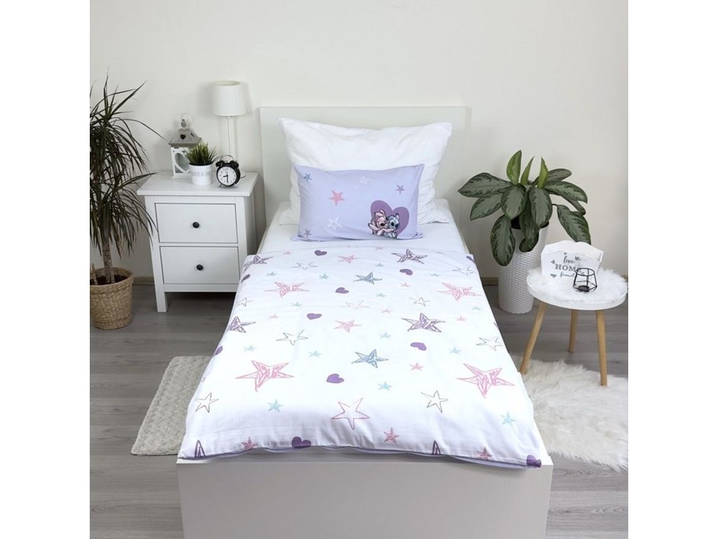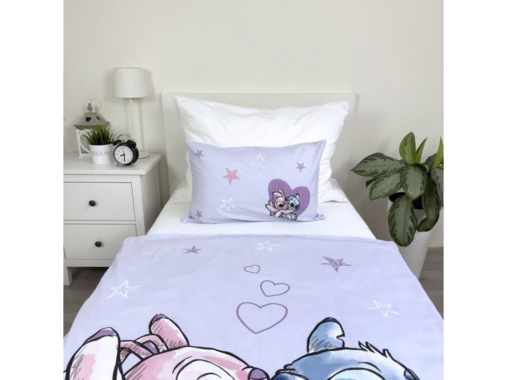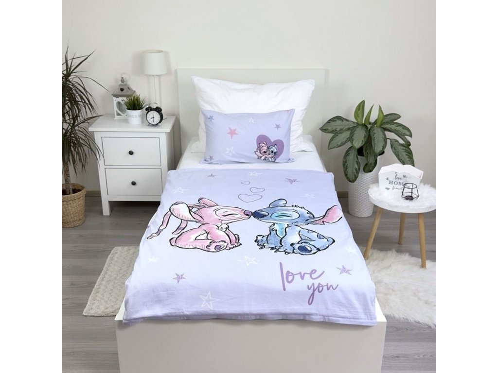 Roztomilé povlečení s motivem Angel a Stitche přinese do dětské postýlky něhu, radost a pohodlí. Přikrývku zdobí obrázek obou postaviček sedících vedle sebe s láskyplnými výrazy, obklopených malými srdíčky. V rohu přikrývky se nachází nápis „love you“, který podtrhuje celkovou atmosféru. Polštářek doplňuje celý set obrázkem Angel a Stitche uvnitř fialového srdce, obklopeného pastelovými hvězdičkami.