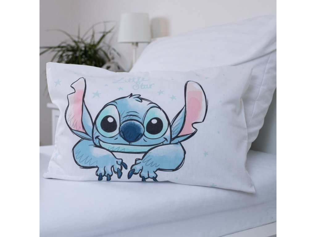 Roztomilé povlečení s motivem Stitche přinese do dětské postýlky radost, pohodlí a kouzelnou atmosféru. Přikrývku zdobí Stitch sedící uprostřed hvězdného pozadí, zatímco polštář doplňuje motiv Stitche s nápisem „Little Star“. Jemné pastelové barvy a hravý design potěší každého malého fanouška tohoto oblíbeného mimozemšťana.