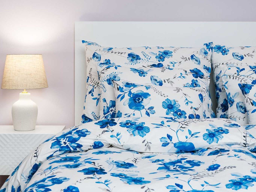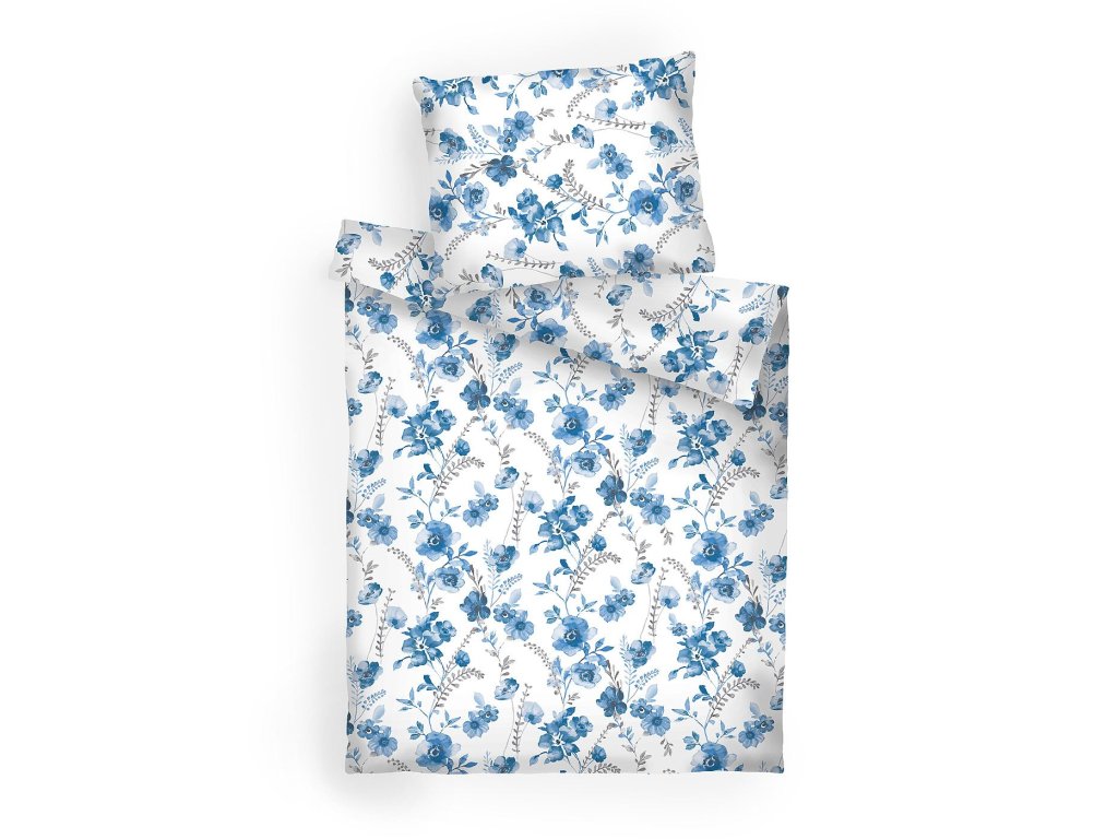 Obsah balení: 1x polštář o rozměru 70x90 cm a 1x povlak na přikrývku o rozměru 140x200 cm.Dezén: Kvítí modré na bílém.