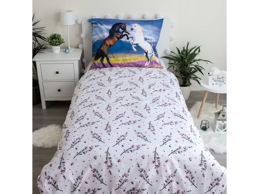 Nechte se unést krásou volnosti a přírody s povlečením, které oslavuje sílu a eleganci koní. Povlak na polštář zobrazuje černého a bílého koně ve vzpínající se póze na pozadí majestátní horské krajiny. Přikrývku zdobí běžící bílý kůň na rozkvetlé louce plné fialových květin, s horami v dálce. Jemný vzor větviček s růžovými kvítky dodává celému setu romantický a harmonický vzhled.