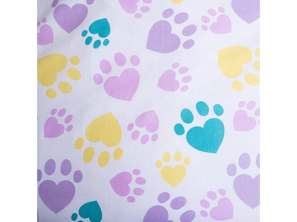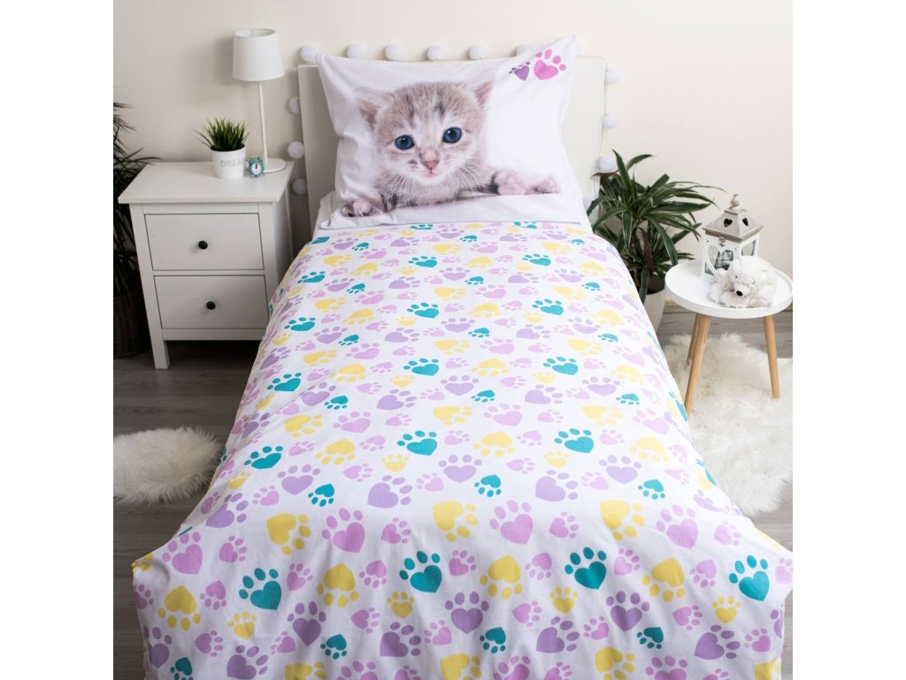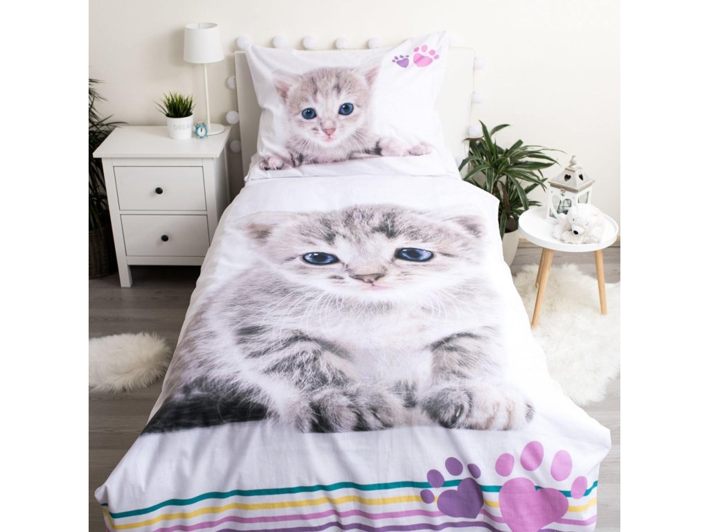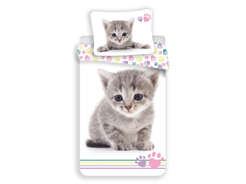 Dopřejte svému dítěti spánek plný něhy s povlečením, které si zamiluje každý malý milovník koček. Povlak na polštář zdobí realistický obrázek šedého kotěte s modrýma očima, doplněný o růžové a fialové tlapičky. Přikrývka zaujme velkým obrázkem kotěte uprostřed a veselými barevnými pruhy a tlapkami ve spodní části. Okraje přikrývky lemují pastelové tlapičky v růžové, žluté, zelené a fialové barvě, které dodávají celému setu hravý a přívětivý vzhled.