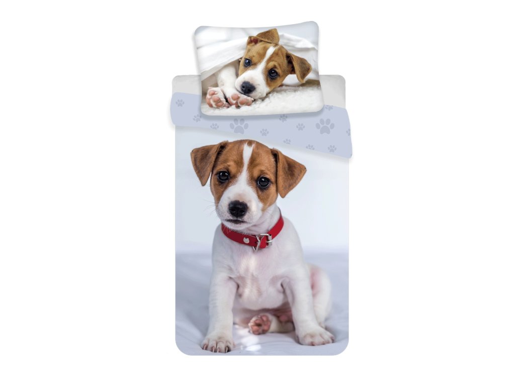 Roztomilý společník pro klidné sny – povlečení Jack Russell přináší do každého pokoje radost a přátelskou atmosféru! Přikrývku zdobí realistický potisk sedícího štěněte s červeným obojkem, zatímco na polštáři se pejsek roztomile schovává pod dekou. Celý set doplňují hravé motivy psích tlapek, které dodávají povlečení veselý a přívětivý vzhled.