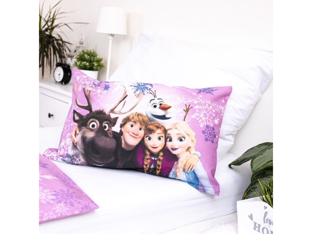 Polštář je ozdoben postavami Svena, Olafa, Anny a Elsy, což z něj činí dokonalý doplněk k přikrývce. Povlečení je vyrobeno ze 100% bavlny, která je měkká, prodyšná a šetrná k dětské pokožce. Praktické zapínání na zip usnadňuje převlékání i údržbu.