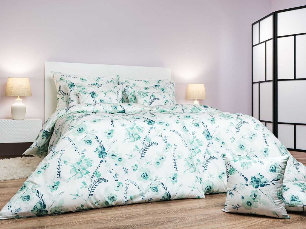 Povlečení satén Kvítí mentolové na bílém 240x200, 2x70x90 cm